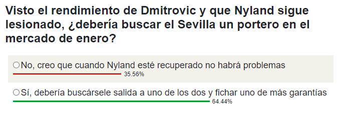 Por eso mismo, la propia afición del Sevilla clama a Víctor Orta porque encuentre una solución para la portería. La marcha de Bono ha dejado un hueco demasiado grande por rellenar que ni Nyland ni Dmitrovic han sabido ocupar, y así lo demuestran los resultados de nuestra #EncuestaHelvetiaED. Casi un 65% de los participantes creen que el Sevilla debería buscar un portero en este mercado de enero si se logra dar salida a alguno de los dos actuales. Sin embargo, un 35% confía en la pronta recuperación de Nyland y que este pueda volver a la titularidad para la segunda parte del campeonato.
