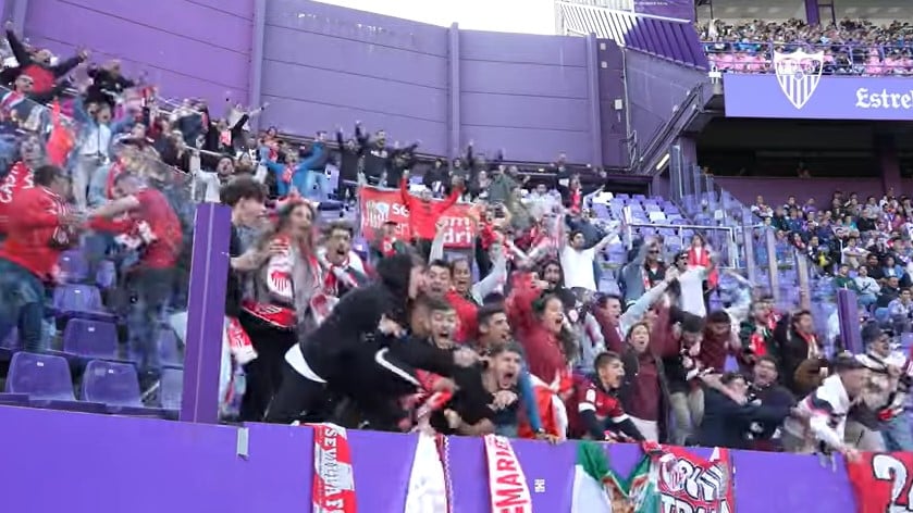 Las caras ya eran de mayor concentración a la hora del calentamiento y antes del partido, donde Rakitic y Escudero aprovecharon para fundirse en un sentido abrazo, dos capitanes del Sevilla en distintas etapas del club de Nervión. Durante todo el partido el centenar de aficionados sevillistas que pudo estar en el José Zorrilla no dejó de animar, y cuando llegaron los goles el éxtasis fue total en esa pequeña zona de la grada de Pucela.