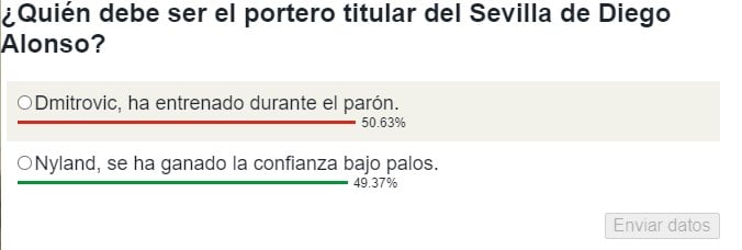 Un 49,63% de los votantes de nuestra #EncuestaHelvetiaED cree que Nyland seguirá siendo el portero elegido para jugar por Diego Alonso, mientras que un 50,63% apuestan por Dmitrovic al haber estado más días a las órdenes de Diego Alonso, algo que puede ser clave para repetir la jugada de marzo y recuperar la titularidad.