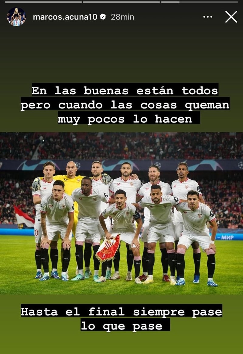 Marcos Acuña también fue protagonista al final del encuentro debido a una publicación en redes sociales, ya que el argentino se desahogó por ahí como creyó conveniente. Un mensaje que no ha gustado absolutamente nada en algunos sectores del Sevilla ya que algunos entienden que es una crítica a la afición. "En las buenas están todos, pero cuando las cosas queman muy pocos lo están. Hasta el final siempre pase lo que pase".