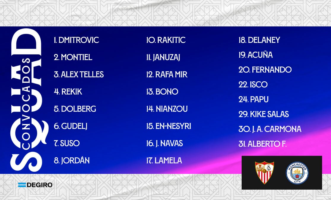 Defensas: Jesús Navas, Montiel, Nianzou, Rekik, José Ángel Carmona, Kike Salas, Alex Telles y Acuña