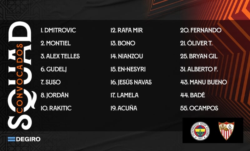 La lista completa con los 21 jugadores convocados por el Sevilla FC para viajar este miércoles a Estambul la componen: Yassine Bono, Marko Dmitrovic, Alberto Flores; Jesús Navas, Gonzalo Montiel, Loïc Badé, Tanguy Nianzou, Marcos Acuña, Alex Telles; Nemanja Gudelj, Fernando Reges, Manu Bueno, Joan Jordán, Óliver Torres, Ivan Rakitic; Lucas Ocampos, Erik Lamela, Suso Fernández, Bryan Gil; Rafa Mir y Youssef En-Nesyri.