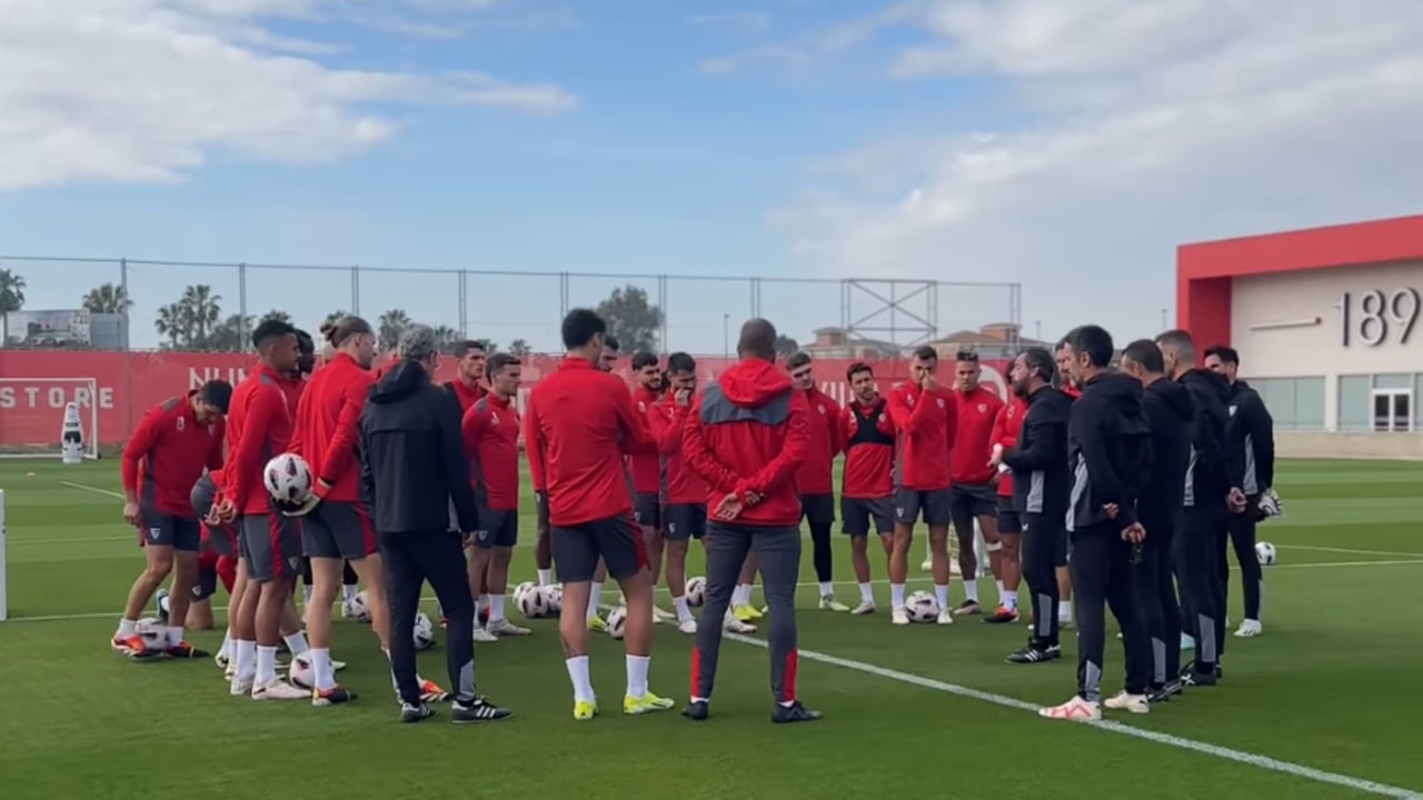 El preparador nervionense, dirigiéndose a sus hombres al comienzo de la sesión de este jueves.SFC