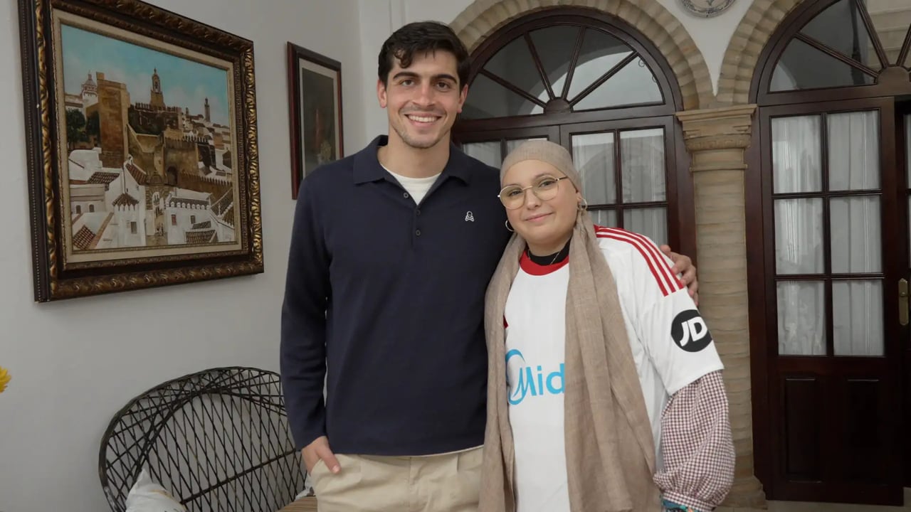 Juanlu Sánchez posa con Blanca en casa de esta luchadora aficionada del Sevilla. Sevilla FC