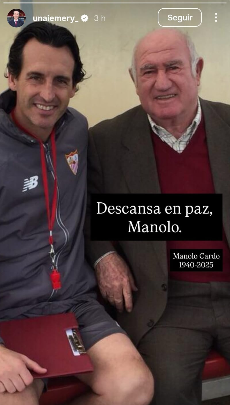 También ha querido mostrar sus condolencias Unai Emery: "Mi más sincero pésame a toda la familia de Manolo Cardo, a todo el Sevilla FC y a todos los que hemos tenido con él una amistad, personal o futbolística. Todavía recuerdo aquella comida en su casa en la que invitó a la directiva del Sevilla. Estuvimos conversando de fútbol. Además hizo un apartado conmigo para darme consejos de lo que él sintió de entrenador y cómo era Sevilla para un entrenador. Me ayudó muchísimo y lo agradecí muchísimo. En el recuerdo para siempre".