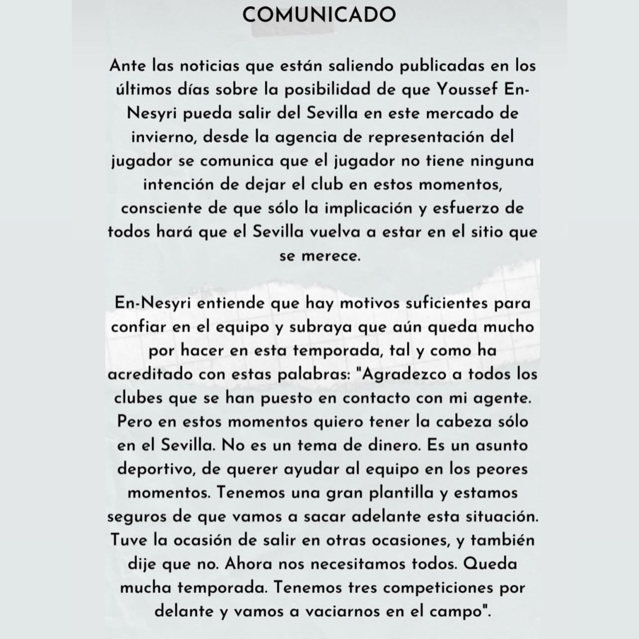 Sin embargo, las diferencias económicas entre los clubes no han sido la principal causa de que el posible trato se rompiera, sino el expreso deseo del ariete, que, como ya se filtraba en la mañana de este martes, había tumbado las negociaciones entre los blanquirrojos y los 'hammers'. Faltaba conocer su versión directa de los hechos, que llegó por la tarde en un comunicado de su agencia de representación, Nas Sport, colgado por él mismo en su perfil de Instagram. "Ante las noticias que están saliendo publicadas en los últimos días sobre la posibilidad de que En-Nesyri salga del Sevilla en este mercado de invierno (...) se comunica que el jugador no tiene ninguna intención de dejar el club en estos momentos, consciente de que sólo la implicación y el esfuerzo de todos hará que el club vuelva a estar en el sitio que se merece. Él entiende que hay motivos suficientes para confiar en el equipo y subraya que aún queda mucho por hacer en esta temporada", reza el texto.