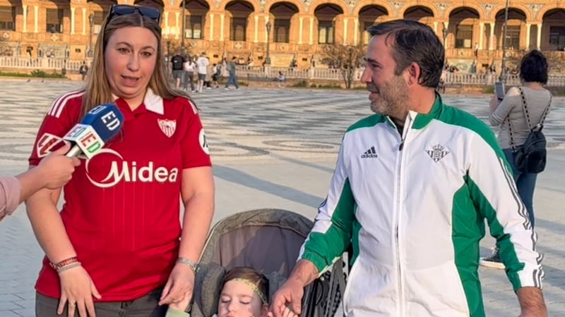 En la icónica Plaza de España, uno de los monumentos que define a la ciudad de Sevilla, pudimos conocer al pequeño Álvaro. Ataviado con una camiseta del Real Betis y las calzonas del Sevilla FC, estuvo acompañado por sus padres Laura y Jesús. En este caso, ellos iban con la camiseta de sus respectivos equipos, la madre la del club de Nervión y el padre la del equipo de Heliópolis. Y es que, aprovechando la fecha, han querido dar a conocer este caso mediante una preciosa propuesta.