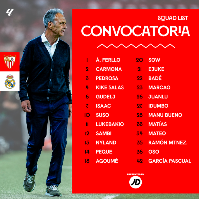 Así las cosas, la lista al completo con los 24 futbolistas convocados por Joaquín Caparrós para este choque entre Sevilla FC y Real Madrid está compuesta por los porteros Orjan Nyland, Álvaro Ferllo y Matías Árbol; los defensas José Ángel Carmona, Juanlu Sánchez, Loïc Badé, Kike Salas, Marcao Teixeira, Ramón Martínez, Adriá Pedrosa y Oso; los centrocampistas Nemanja Gudelj, Lucien Agoumé, Djibril Sow, Sambi Lokonga y Manu Bueno; y los atacantes Suso Fernández, Chidera Ejuke, Idumbo Muzambo, Dodi Lukebakio, Peque Fernández, Mateo Mejía, Isaac Romero y Álvaro García Pascual.