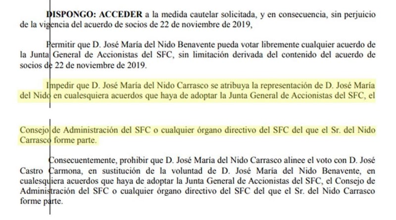 En cualquier caso, la Audiencia Provincial las elimina posteriormente, entendiendo que de no llegar a un consenso, cada uno puede votar en su línea. Al mismo tiempo, declara incompetente al Mercantil. Tras esto, Del Nido Benavente solicita cautelares para votar libremente y le son concedidas.