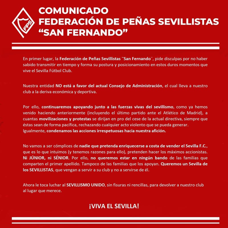 "En primer lugar, la Federación de Peñas Sevillistas 'San Fernando' pide disculpas por no haber sabido transmitir en tiempo y forma su postura y posicionamiento en estos duros momentos que vive el Sevilla Fútbol Club. Nuestra entidad NO está a favor del actual consejo de administración, el cual lleva a nuestro club a la deriva económica y deportiva. Por ello, continuaremos apoyando junto a las fuerzas vivas del sevillismo, como ya hemos venido haciendo anteriormente (incluyendo el último partido ante el Atlético de Madrid), a cuantas movilizaciones y protestas se dirijan en pro del cese de la actual directiva, siempre que éstas sean de forma pacífica, rechazando cualquier acto violento que se pueda generar. Igualmente, condenamos las acciones irrespetuosas hacia nuestra afición", comienza diciendo el organismo, que secunda la respuesta masiva a la condena del máximo mandatario.