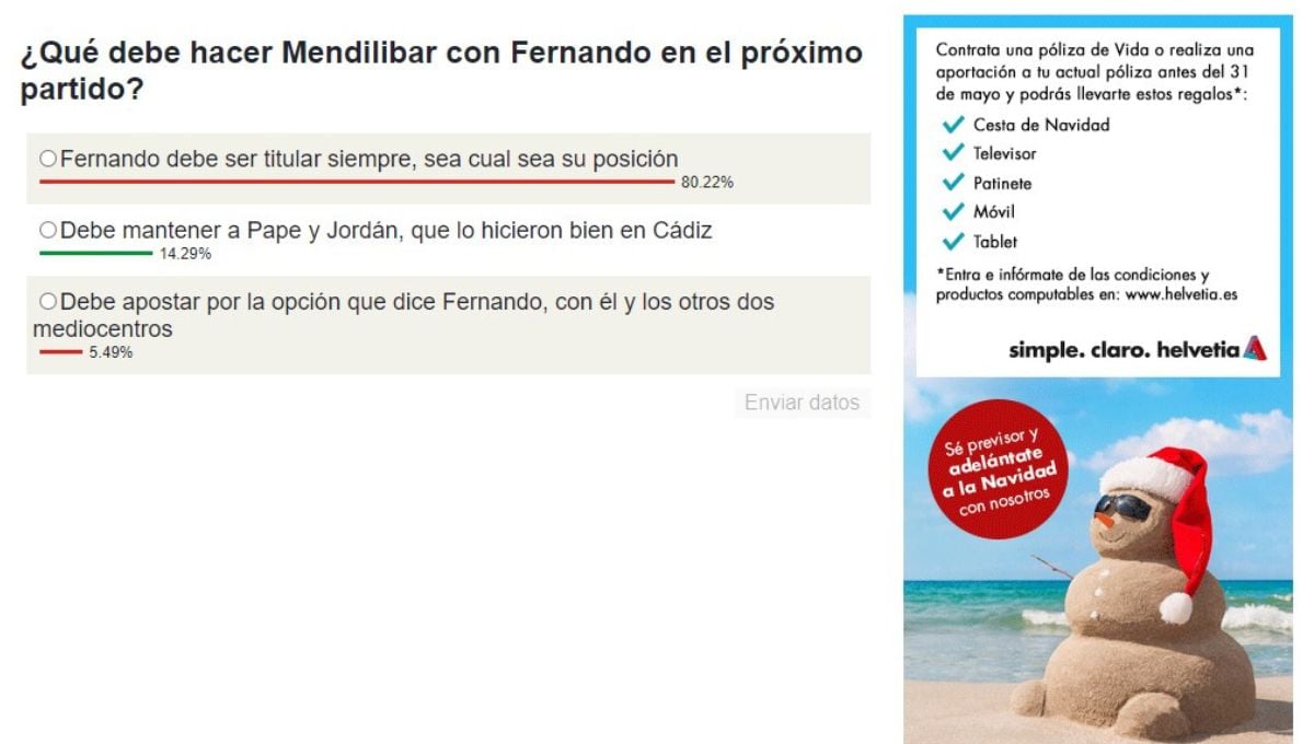Pero aún más lo espera la afición. De hecho, antes de que se confirmara la lesión de Joan Jordán, en la #EncuestaHelvetia, los sevillistas apostaban por la presencia de Fernando Reges en el once, fuera en la posición que fuera y con los compañeros que le tocasen.