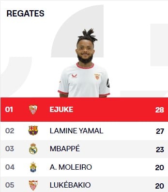 Así las cosas, Ejuke sigue liderando la tabla de máximos regateadores de LaLiga, por delante de estrellas del nivel de Lamine Yamal, Mbappé o Vinicius. El nigeriano ha completado con éxito 28 regates, por los 27 de barcelonista y los 23 del madridista, seguidos por Alberto Moleiro (20) y otro sevillista, pues Lukébakio también se ha colado en el 'top 5' con 20 regates.