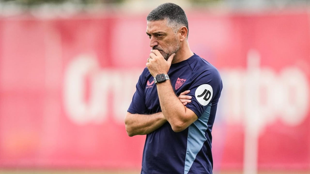García Pimienta, en tono pensativo, durante un entrenamiento del Sevilla.Sevilla FC