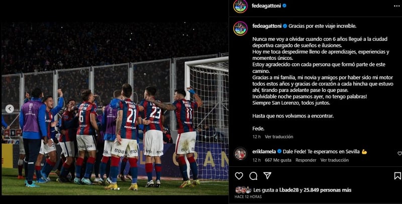 Pero 24 horas después de acabar el partido y ya en frío, el que fuera capitán de San Lorenzo ha querido despedirse de nueva de toda la hinchada del 'Ciclón' a través de sus redes sociales. "Nunca me voy a olvidar cuando con 6 años llegué a la ciudad deportiva cargado de sueños e ilusiones. Hoy me toca despedirme lleno de aprendizajes, experiencias y momentos únicos. Estoy agradecido con cada persona que formó parte de este camino. Gracias a mi familia, mi novia y amigos por haber sido mi motor todos estos años y gracias de corazón a cada hincha que estuvo ahí, tirando para adelante pase lo que pase. ¡Inolvidable noche pasamos ayer, no tengo palabras! Siempre San Lorenzo, todos juntos. Hasta que nos volvamos a encontrar. Fede", escribía el central del Sevilla en su perfil de Instagram la pasada madrugada.