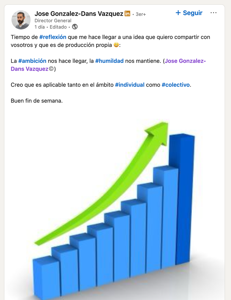 Aunque no es una manera habitual de hacerlo, el ejecutivo natural de Oleiros lleva tiempo abonándose a la práctica de compartir sus reflexiones en Linkedin, una red social enfocada al mundo profesional. González-Dans escribía la semana pasada sobre la amistad, por ejemplo: "Hoy, domingo en el que le hemos ganado una hora a la la vida, desde el silencio que reina en mi casa, he leído este artículo que pone de manifiesto que la inutilidad es una de las bases de la amistad. Desde esta calma de la que estoy rodeado ahora mismo, pensando sobre esta idea, he llegado a la conclusión de que estoy rodeado de “inútiles” en mi vida personal, que yo mismo he sido el primero en buscarlos y en encontrarlos, y que nunca he valorado el interés en la amistad; creo que todo lo contrario, he buscado ayudar sin esperar nada a cambio. Me encantaría que la gente practicara el uso de este filtro". Ya seguro tras su destitución, dejaba esta otra 'perla': "Tiempo de reflexión que me hace llegar a una idea que quiero compartir con vosotros y que es de producción propia. La ambición nos hace llegar, la humildad nos mantiene. Creo que es aplicable tanto en el ámbito individual como colectivo. Buen fin de semana".