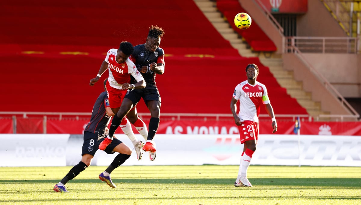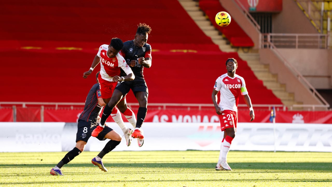 Kévin Denkey salta con el ahora madridista Aurelien Tchouaméni durante un Mónaco-Nimes.CORDON PRESS