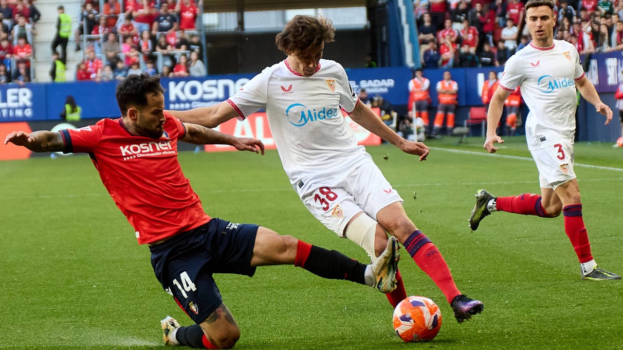 El carrilero hispalense, presionado por el osasunista Rubén García.CORDON PRESS