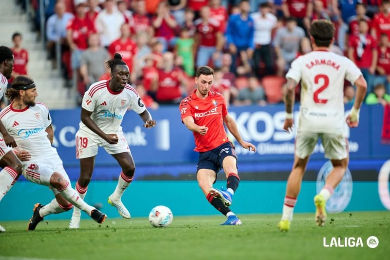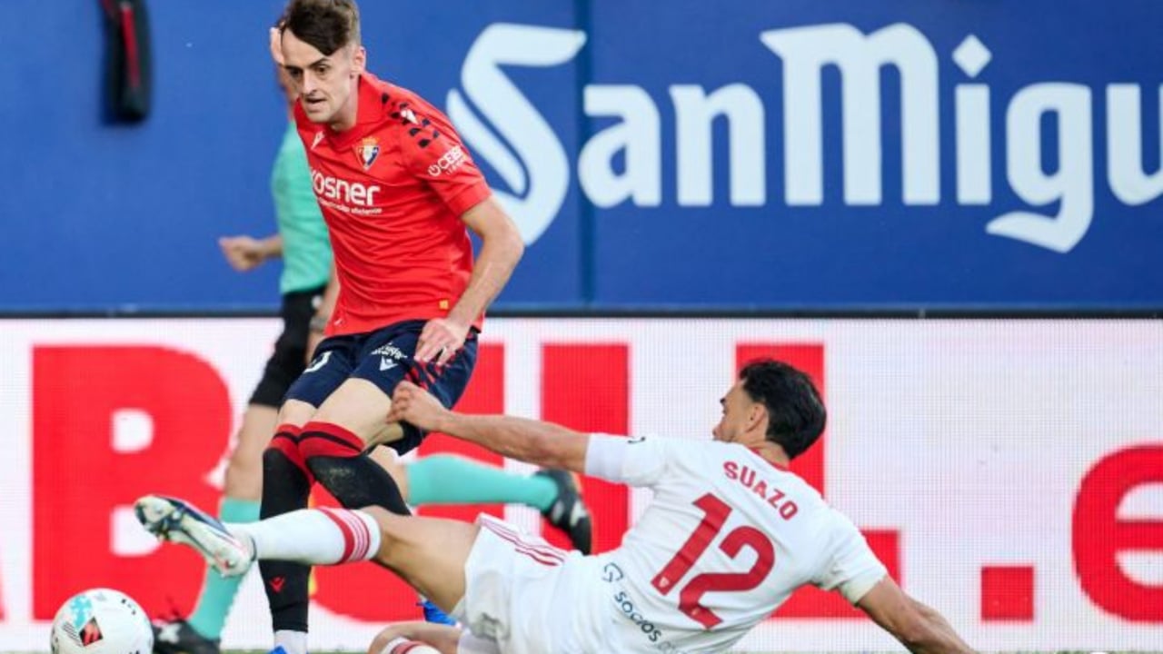 Suazo trata de arrebatar el balón a Oroz durante el partido en El Sadar.LaLiga