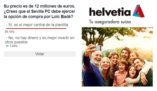 Por todo ello, la afición no tiene dudas, como ha demostrado en el resultado de nuestra #EncuestaHelvetiaED, donde el 96% de los votantes ha mandado un mensaje claro a Pepe Castro y Monchi: paguen ya por Loïc Badé. Los 12 millones de euros merecen la pena por el mejor centra de la plantilla del Sevilla. En cambio, tan solo un 4% no apostaría por el galo y preferiría invertir ese dinero en otras posiciones del campo.
