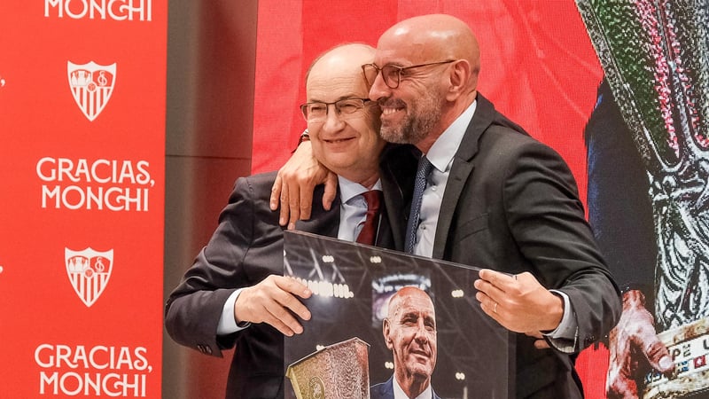 El presidente nervionense, José Castro, mantiene "las puertas abiertas" para Monchi, reconociendo su espectacular legado para la entidad y fundiéndose en un largo abrazo con él tras entregarle un obsequio