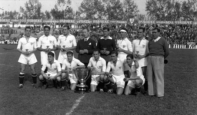 En la década de los 50, el sevillismo vivió episodios históricos, como el Pichichi de Juan Arza en 54/55, la llegada al banquillo de Helenio Herrera, con el que se mantuvo en la parte alta de la tabla desde la 53/54 hasta la 56/57 (un quinto puesto, dos cuartos y un segundo) y, por supuesto, la inauguración el 7 de septiembre de 1958 del nuevo estadio, al que se le puso el nombre del mítico presidente Ramón Sánchez-Pizjuán, fallecido dos años antes. Además, la segunda posición de la 56/57, por detrás del Real Madrid de Di Stefano, le permitió estrenarse el curso siguiente en la Copa de Europa, en la que alcanzó los cuartos de final, donde cayó con los de Chamartín.