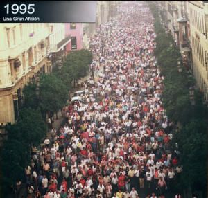 El mes de agosto de 1995, el Sevilla fue descendido administrativamente a Segunda B por no presentar a tiempo los avales exigidos por la Ley del Deporte para convertirse en Sociedad Anónima. El Sevillismo inundó las calles con una manifestación multitudinaria y finalmente se dio marcha atrás y se amplió la Liga a 22. Fue el reflejo de la inestabilidad institucional vivida en el club, cristalizada en los cuatro presidentes en dicha campaña (Cuervas, Del Nido, Escobar y De Caldas) y extrapolada a lo futbolístico, con el descenso a Segunda en la 96/97. Dos años necesitaron los sevillistas para regresar a Primera, si bien la vuelta resultó fue efímera, ya que en la 99/00 acabó último y consumó su cuarto descenso.