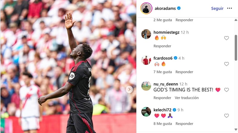 De ese modo, el punta sevillista publicó un mensaje en su perfil de Instagram en el que daba las gracias a Dios por su tanto. “Gloria a Dios. Un gran esfuerzo del equipo”, expresó el delantero en la red social Adams, que recibió numerosas respuestas tanto de sus compañeros actuales, entre ellos Vlachodimos, Fabio Cardoso, Jordán, Nyland o Álvaro Ferllo, como del curso anterior, caso de Iheahacho.