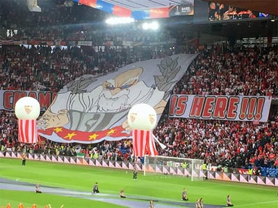 Desde la primera en 2006 en Eindhoven, donde el abuelo aparecía vestido con la equipación blanca y medias negras, acompañado de una bandera blanquirroja y una corona de laurel, bajo el lema 'Somos grandes'. Ahí el Sevilla venció 4-0 al Middlesbrough y desde entonces, el ya conocido como el 'abuelo del Sevilla' no faltó a las citas más importantes. Un año después volvía a hacer acto de presencia en Glasgow.
