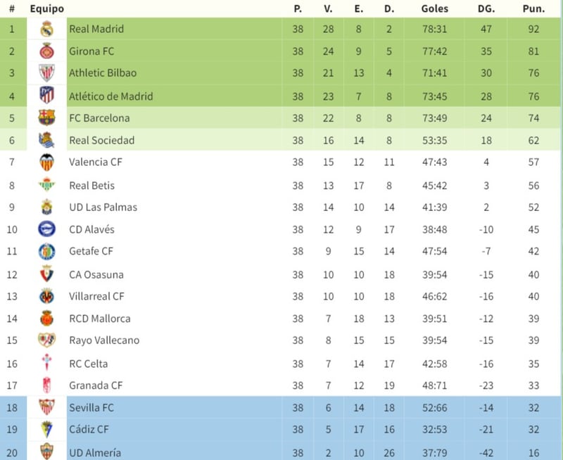 Por arriba, el Real Madrid sería el campeón con 92 puntos y con los blancos, irían a Champions League el Girona (81 puntos), Athletic Club (76 puntos) y Atlético de Madrid (76 puntos). El Barça se quedaría sin Liga de Campeones en la quinta plaza con 74 puntos y la Real Sociedad sería sexta con 62.