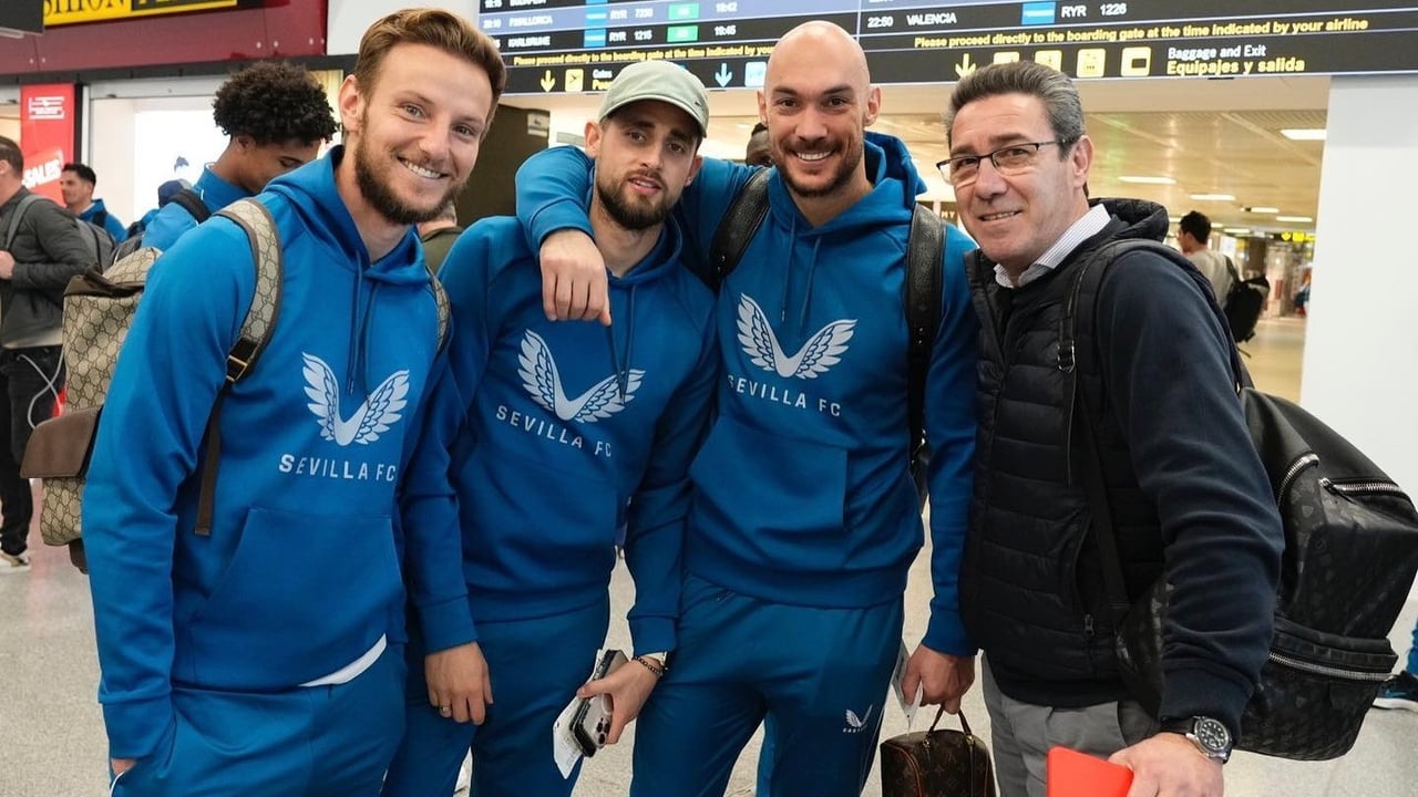 Rakitic, Dmitrovic y el delegado, Juan Martagón, en una imagen premonitoria, con el destino Valencia en la pantalla de avisos del Aeropuerto de Sevilla.@juan.martagon.2