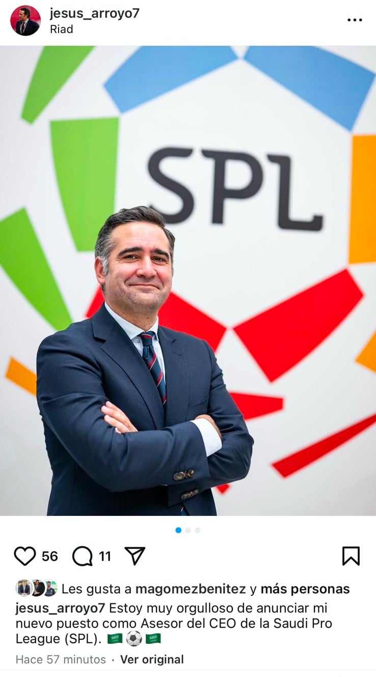 "Estoy muy orgulloso de anunciar mi nuevo puesto como asesor del director ejecutivo de la Saudí Pro League (liga de fútbol de Arabia), Omar Mugharbel, durante los dos próximos años. Es un verdadero placer unirme al país y estar alineado con su visión deportiva", ha manifestado, orgullo de la exaltación que han hecho en el país árabe de su espectacular currículum durante 18 años trabajando en el mundo del fútbol como "distinguido ejecutivo" y como "experto en el área jurídica".