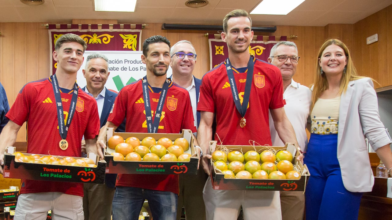Fueron el centrocampista del París Saint Germain, bético, y Navas, sevillista, los que recibieron su peso en tomates, como los ismaelitas solían hacer con oro y diamantes con su jefe espiritual, el Aga Khan, en el pasado: 80 y 64 kilos de tomates, respectivamente, se llevaron para casa, recuerda Efe. El barcelonista y ex canterano verdiblanco Pablo Páez Gavira 'Gavi', el tercero de los internacionales palaciegos, no pudo estar en la magna cita teutona por lesión, aunque sí estuvo en la Liga de Naciones que los de Luis de la Fuente lograron ante Croacia un año antes y en la consiguiente recepción del pueblo sevillano a sus futbolistas, pues no es en absoluto habitual que entre sus vecinos, que supusieron en su época de mayor esplendor siempre menos de 40.000 habitantes, haya no ya tantos deportistas de elite, sino tantos campeones.