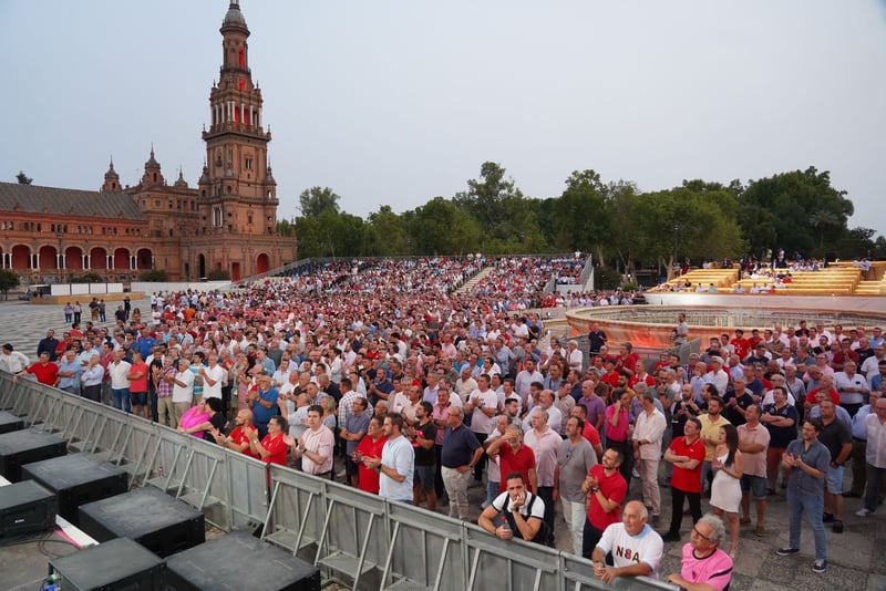 Más de 5.000 socios del Sevilla Fútbol Club se dieron cita anoche en la Plaza de España donde tuvo lugar la duodécima edición de Fieles de Nervión, acto donde el club hispalense reconoce y homanajea a aquellos socios más longevos y los que pudieron además fotografiarse con la séptima copa de la Europa League conseguida el pasado 31 de mayo en Budapest.