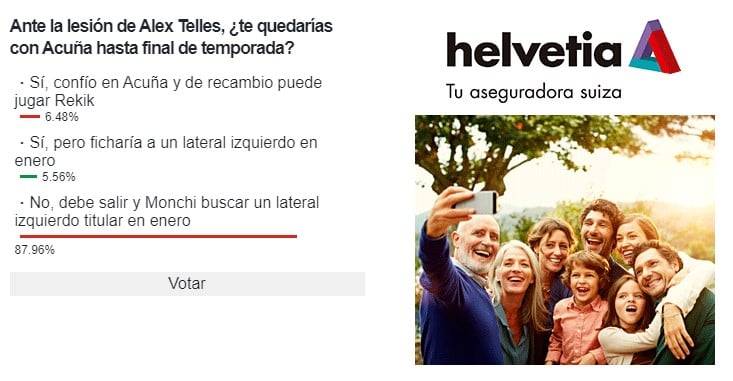 Apenas un 12,04% se quedaría con el 'Huevo', al menos, hasta final de temporada, de los cuales un 6,48% no ficharía a nadie, apostando tirar de Rekik mientras Telles se recupera. Un 5,56% también se conservaría al argentino pero acudiría al mercado para fichar un lateral zurdo aunque no fuera una gran inversión.