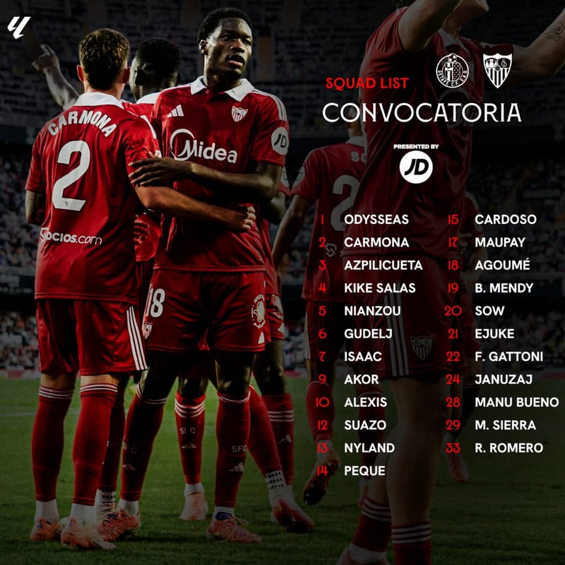 Los 23 alistados para el desplazamiento a tierras madrileñas son los siguientes: los porteros Odysseas Vlachodimos, Örjan Nyland y Rafa Romero; los defensas José Ángel Carmona, Kike Salas, César Azpilicueta, Tanguy Nianzou, Nemanja Gudelj, Fábio Cardoso, Federico Gattoni y Gabriel Suazo; los centrocampistas Lucien Agoumé, Batista Mendy, Djibril Sow, Manu Bueno, 'Peque' Fernández, Adnan Januzaj, Chidera Ejuke y Miguel Sierra; así como los delanteros Alexis Sánchez, Isaac Romero, Neal Maupay y Akor Adams.