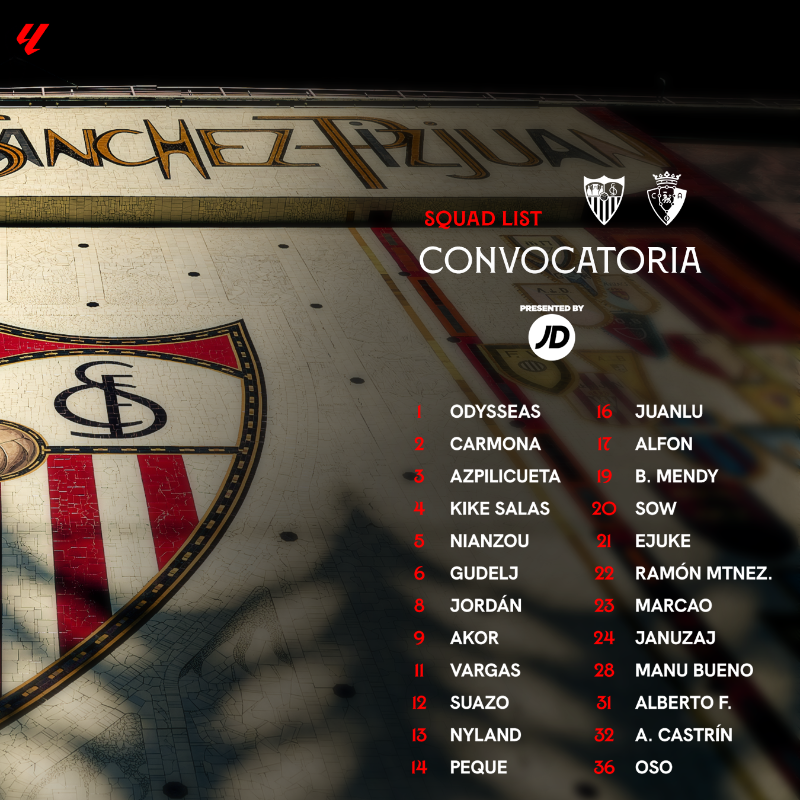 La nómina de 24 elegidos por el 'Pelado' Almeyda para la 'final' ante el conjunto rojillo es la conformada por: los porteros Örjan Nyland, Odysseas Vlachodimos y Alberto Flores; los defensas José Ángel Carmona, Juanlu Sánchez, César Azpilicueta, Tanguy Nianzou, Marcao Teixeira, Kike Salas, Ramón Martínez, Andrés Castrín, Gabriel Suazo y Joaquín Martínez 'Oso'; los centrocampistas Nemanja Gudelj, Batista Mendy, Manu Bueno, Joan Jordán, Djibril Sow, Rubén Vargas, Alfon González, 'Peque' Fernández, Adnan Januzaj y Chidera Ejuke; así como el delantero Akor Adams.