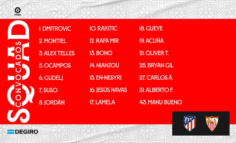 Al completo, la lista de 21 convocados (sólo 18 profesionales) para el partido que el Sevilla FC disputará este sábado ante el Atlético de Madrid la componen: Yassine Bono, Marko Dmitrovic, Alberto Flores; Jesús Navas, Gonzalo Montiel, Marcos Acuña, Alex Telles, Tanguy Nianzou, Nemanja Gudelj; Manu Bueno, Pape Gueye, Joan Jordán, Ivan Rakitic, Óliver Torres; Suso Fernández, Lucas Ocampos, Erik Lamela, Bryan Gil, Carlos Álvarez; Rafa Mir y Youssef En-Nesyri.