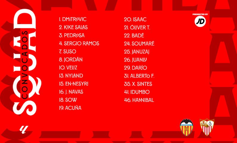 La lista completa de 23 es la compuesta por los porteros: Marko Dmitrovic, Örjan Nyland y Alberto Flores; los defensas Jesús Navas, Juanlu Sánchez, Darío Benavides, Sergio Ramos, Loïc Badé, Kike Salas, Xavi Sintes, Adrià Pedrosa y Marcos Acuña; los centrocampistas Boubakary Soumaré, Djibril Sow, Joan Jordán, Óliver Torres, Hannibal Mejbri, Suso Fernández, Stanis Idumbo Muzambo y Adnan Januzaj; y los delanteros Alejo Véliz, Isaac Romero y Youssef En-Nesyri. El palaciego, el internacional suizo, el gaditano y Ocampos están apercibidos, aunque este último, al no haber podido ser llamado a filas, no se juega la quinta contra el Valencia CF, circunstancia que impediría al que la viera tomar parte en la vista del 25 de febrero al Santiago Bernabéu para verse las caras con el líder de Primera división, el Real Madrid.