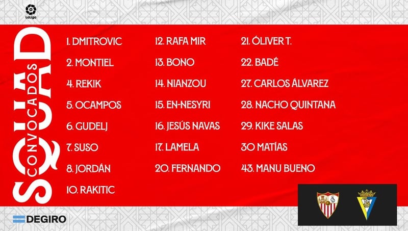 La lista de convocados del Sevilla ante el Cádiz está formada por: Bono, Dmitrovic, Matías Árbol, Jesús Navas, Montiel, Kike Salas, Rekik, Badé, Nianzou, Gudelj, Manu Bueno, Fernando, Jordán, Rakitic, Óliver Torres, Ocampos, Nacho Quintana, Suso, Lamela, Carlos Álvarez, Rafa Mir y En-Nesyri.