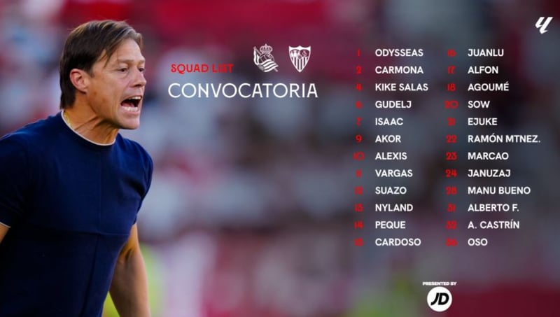 Así las cosas, la lista al completo con los 24 jugadores convocados por Matías Almeyda para el duelo entre Real Sociedad y Sevilla FC es la compuesta por los porteros Odysseas Vlachodimos, Orjan Nyland y Alberto Flores; los defensores José Ángel Carmona, Juanlu Sánchez, Fábio Cardoso, Ramón Martínez, Marcao, Kike Salas, Andrés Castrín, Gabriel Suazo y Joaquín 'Oso'; los centrocampistas Nemanja Gudelj, Lucien Agoumé, Djibril Sow y Manu Bueno; y los atacantes Adnan Januzaj, Rubén Vargas, Alfon González, Chidera Ejuke, Alexis Sánchez, 'Peque' Fernández, Isaac Romero y Akor Adams.