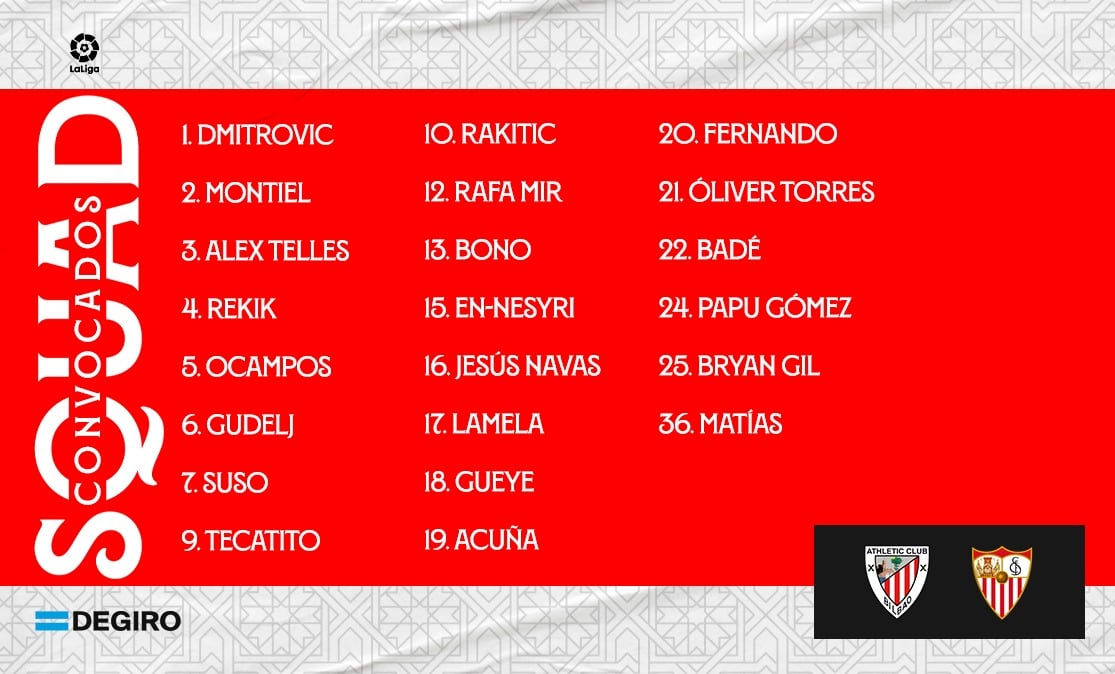 La buena noticia para el preparador nervionense es la de la vuelta a la convocatoria de Marcos Acuña, que ante Valencia y Villarreal ya cumplió sus dos partidos de sanción. Así, la lista de convocados al completo la conforman: Bono, Dmitrovic, Matías, Jesús Navas, Montiel, Badé, Acuña, Alex Telles, Rekik, Gudelj, Fernando, Gueye, Óliver Torres, Rakitic, Lamela, Papu Gómez, Bryan Gil, Suso, Lucas Ocampos, Tecatito, Rafa Mir y En-Nesyri.