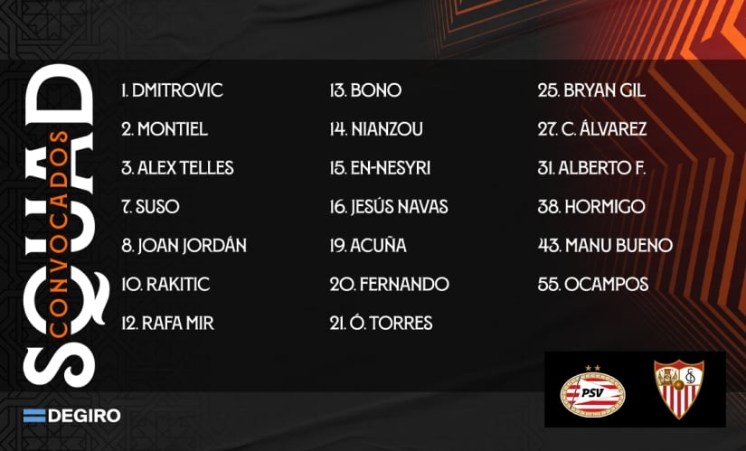 La lista completa de 20 jugadores que han viajado a los Países Bajos para intentar hacer bueno el 3-0 del encuentro de ida disputado el pasado jueves en el Ramón Sánchez-Pizjuán la conforman: Bono, Dmitrovic, Alberto Flores; Jesús Navas, Gonzalo Montiel, Tanguy Nianzou, Diego Hormigo, Marcos Acuña, Alex Telles; Fernando Reges, Joan Jordán, Manu Bueno, Ivan Rakitic, Óliver Torres, Lucas Ocampos, Suso Fernández, Bryan Gil, Carlos Álvarez, Rafa Mir y Youssef En-Nesyri.