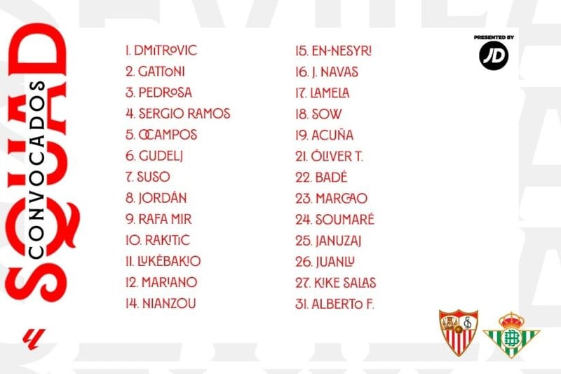 La lista de citados, que podría denominarse perfectamente prelista al incluir a 26 integrantes y necesitar de tres nombres tachados en el acta del colegiado del encuentro ante el Real Betis, el extremeño Gil Manzano, antes de que arranque el partido de los partidos en la capital hispalense está compuesta por los siguientes efectivos: los porteros Dmitrovic y Alberto Flores; los defensas Juanlu, Jesús Navas, Badé, Gudelj, Sergio Ramos, Marcao, Gattoni, Nianzou, Kike Salas, Pedrosa y Acuña; los centrocampistas Soumaré, Sow, Joan Jordán, Rakitic, Óliver Torres, Lukébakio, Lamela, Ocampos, Suso y Januzaj; y los delanteros Rafa Mir, En-Nesyri y Mariano.