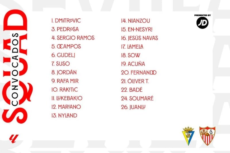 La citación completa de 23 expedicionarios es la siguiente: los porteros Dmitrovic y Nyland; los defensas Juanlu, Jesús Navas, Badé, Sergio Ramos, Gudelj, Nianzou, Acuña y Pedrosa; los centrocampistas Fernando, Joan Jordán, Rakitic, Sow, Soumaré, Óliver Torres, Lamela, Ocampos, Suso y Lukébakio; y los delanteros En-Nesyri, Rafa Mir y Mariano. No viaja en esta ocasión tampoco un tercer guardameta, si bien la cercanía con la 'Tacita de Plata' permitiría subsanar cualquier contingencia con el serbio o el noruego rápidamente con Matías Árbol o Alberto Flores, pues el único inhabilitado de la nómina de porteros es Alfonso Pastor, operado a principios de verano de menisco.