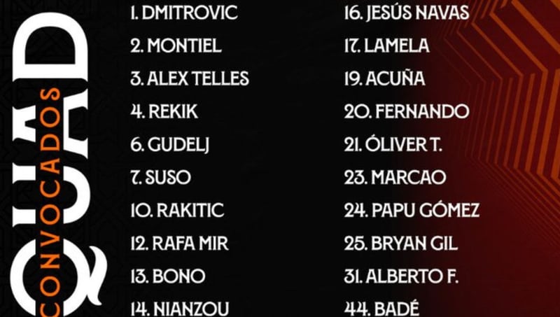 La lista de convocados del Sevilla ante el Manchester United está formada por Bono, Dmitrovic, Alberto Flores, Jesús Navas, Gonzalo Montiel, Badé, Marcao, Nianzou, Rekik, Acuña, Alex Telles, Gudelj, Fernando Reges, Óliver Torres, Rakitic, Lucas Ocampos, Erik Lamela, Papu Gómez, Bryan Gil, Suso, Rafa Mir y En-Nesyri.