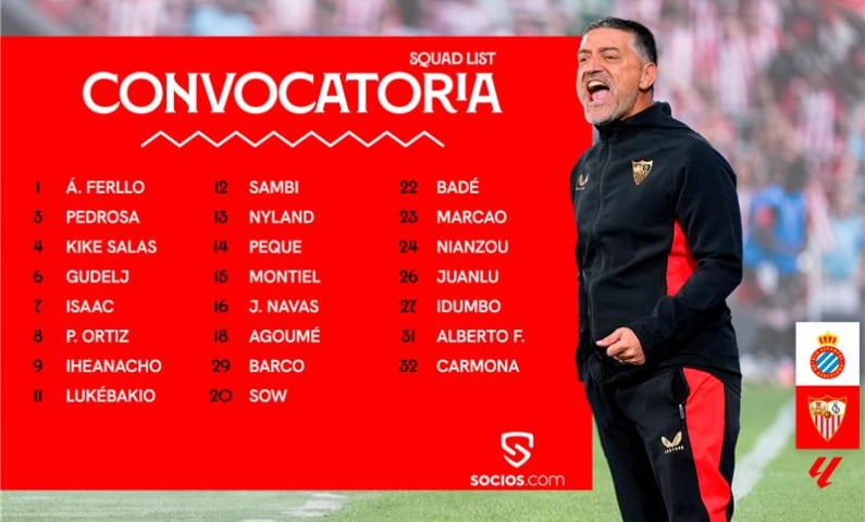 El Sevilla FC ha ofrecido la lista de convocados para el encuentro de este viernes por la noche (21:00 horas) en Cornellà-El Prat ante el RCD Espanyol, del que le separan apenas dos puntos en la clasificación de Primera división. Como era de esperar, las únicas ausencias obligadas para García Pimienta serán las de los tres lesionados, dos de ellos de cierta consideración (Saúl Ñíguez lleva un mes K.O. por una rotura fibrilar de alto grado en el bíceps femoral del muslo izquierdo y le queda, al menos, otro en el dique seco, seguramente algunas semanas más; y Chidera Ejuke se produjo una dolencia de similar dureza en Montjuic, pero en los isquiotibiales de la misma pierna), porque lo de Suso Fernández no le llevará mucho más de un par de semana, al lastimarse el aductor largo del muslo izquierdo. Ni Jesús Navas, con su patología crónica en la cadera derecha, ni Adrià Pedrosa, con una sobrecarga en los gemelos, han tenido problemas para llegar.
