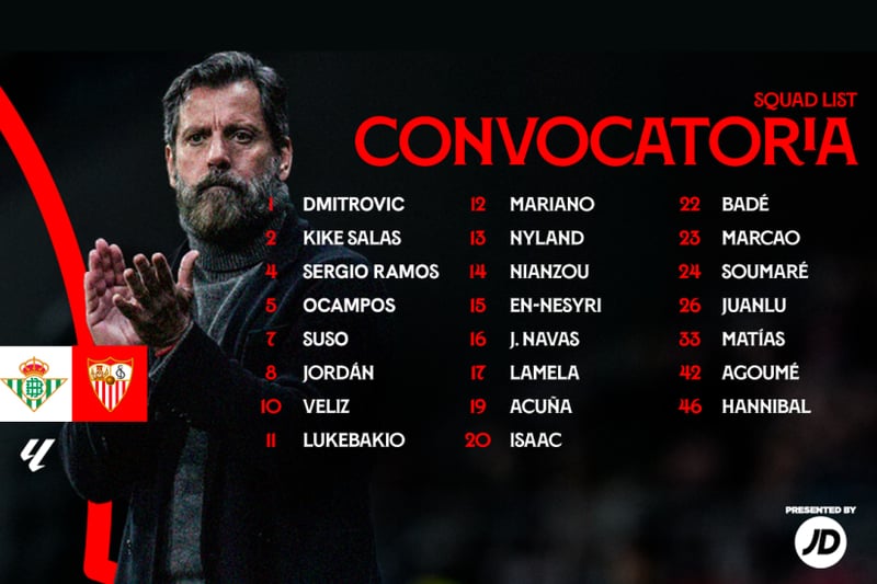 La lista completa de convocados para el encuentro de máxima rivalidad hispalense que cerrará el curso 23/24 por parte sevillista la conforman los siguientes futbolistas: los cancerberos Marko Dmitrovic, Örjan Nyland y Matías Árbol; los defensas Jesús Navas, Juanlu Sánchez, Loïc Badé (uno de los dos apercibidos), Sergio Ramos, Tanguy Nianzou, Kike Salas, Marcao Teixeira y Marcos Acuña; los centrocampistas Lucien Agoumé, Boubakary Soumaré, Joan Jordán, Hannibal Mejbri, Suso Fernández (también amenazado de suspensión), Lucas Ocampos, Erik Lamela, Dodi Lukébakio; y los delanteros Alejo Véliz, Mariano Díaz, Isaac Romero y Youssef En-Nesyri.