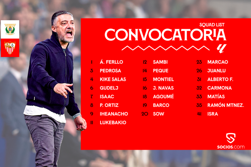 La citación completa está compuesta por: los porteros Álvaro Fernández, Alberto Flores y Matías Árbol; los defensas José Ángel Carmona, Gonzalo Montiel, Marcao Teixeira, Kike Salas, Ramón Martínez, Adrià Pedrosa y Valentín Barco; los centrocampistas Nemanja Gudelj, Pedro Ortiz, Albert Sambi Lokonga, Lucien Agoumé, Djibril Sow, Gerard 'Peque' Fernández, Jesús Navas, Dodi Lukébakio, Isra Domínguez y Juanlu Sánchez; y los delanteros Kelechi Iheanacho e Isaac Romero. El lateral catalán y el delantero lebrijano están apercibidos de sanción, por lo que, si ven una amonestación frente a los 'pepineros', se perderán la siguiente cita oficial, prevista para el domingo 24 de noviembre a las 21:00 horas contra el Rayo Vallecano en el Estadio Ramón Sánchez-Pizjuán.