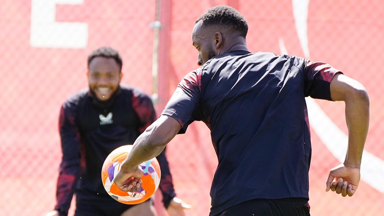 Ejuke, sonriente pese a todo, presencia una acción de Lukébakio en el partidillo de este jueves en la Carretera de Utrera.SFC