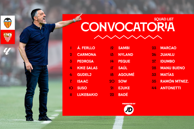 La citación completa de 23 está conformada por: los porteros Örjan Nyland, Álvaro Fernández y Matías Árbol; los defensas José Ángel Carmona, Juanlu Sánchez, Loïc Badé, Ramón Martínez, Kike Salas, Nemanja Gudelj, Marcao Teixeira y Adrià Pedrosa; los centrocampistas Lucien Agoumé, Albert Sambi Lokonga, Saúl Ñíguez, Djibril Sow, Manu Bueno, 'Peque' Fernández y Suso Fernández; y los atacantes Chidera Ejuke, Dodi Lukébakio, Stanis Idumbo Muzambo, Leandro Antonetti e Isaac Romero. Para colmo, se encuentran apercibidos de sanción el polivalente zaguero y medio serbio, el central y lateral zurdo aruncitano, así como el mediocampista belga, por lo que, si vieran una quinta amarilla en Mestalla, no estarían disponibles para el choque en casa del Domingo de Resurrección (a partir de las 18:30 horas) contra el Deportivo Alavés.